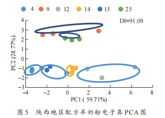 通過(guò)電子鼻雷達(dá)圖推測(cè)羊奶粉中揮發(fā)性物質(zhì)主要為醛酮類(lèi)、酸類(lèi)、烷烴類(lèi)、醇類(lèi),部分配方羊奶粉還有胺類(lèi)、氨類(lèi)及烷烴類(lèi)物質(zhì)。此外,陜西地區(qū)各市之間的純羊奶粉性質(zhì)相似。通過(guò)電子鼻雷達(dá)圖可以準(zhǔn)確快速地反映不同羊奶粉樣品的整體風(fēng)味