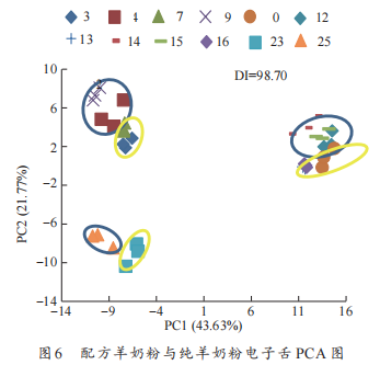 純羊奶粉與配方羊奶粉的電子舌測(cè)定結(jié)果見(jiàn)圖6。根據(jù)PC1可以將配方羊奶粉和純羊奶粉分為3個(gè)區(qū)域,溯源到奶粉產(chǎn)地,可以發(fā)現(xiàn)羊奶粉13、14、15、16均為西安市羊奶粉,羊奶粉7、9、10、12為渭南市羊奶粉,羊奶粉23、25為咸陽(yáng)地區(qū)羊奶粉,羊奶粉3、4為寶雞市羊奶粉,結(jié)果顯示咸陽(yáng)市羊奶粉與其他市羊奶粉距離較遠(yuǎn),可更好地區(qū)分地域。
