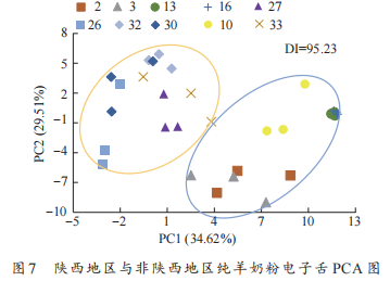 對(duì)29種羊奶粉按陜西地區(qū)與非陜西地區(qū)分別選擇5種進(jìn)行區(qū)分,陜西地區(qū)與非陜西地區(qū)純羊奶粉的電子舌PCA結(jié)果見(jiàn)圖7。根據(jù)PC1和PC2可以將羊奶粉歸為2個(gè)區(qū)域,陜西地區(qū)和非陜西地區(qū)純羊奶粉距離均較遠(yuǎn)且各地區(qū)分布較集中,表明兩地區(qū)之間的差異性可得到較好區(qū)分,因此基于電子舌技術(shù)可實(shí)現(xiàn)對(duì)陜西地區(qū)及非陜西地區(qū)純羊奶粉的區(qū)分。