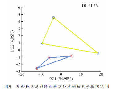 電子鼻測(cè)定陜西地區(qū)及非陜西地區(qū)純羊奶粉的PCA結(jié)果見(jiàn)圖9。根據(jù)PCA結(jié)果可以看出,陜西地區(qū)(黃色區(qū)域)與非陜西地區(qū)(藍(lán)色區(qū)域)純羊奶粉數(shù)據(jù)點(diǎn)相距較遠(yuǎn),得到了較好區(qū)分。