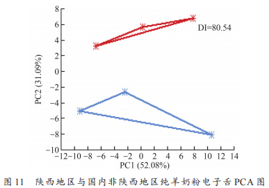 陜西地區(qū)與國(guó)內(nèi)非陜西地區(qū)純羊奶粉的電子舌PCA結(jié)果見(jiàn)圖11。紅色區(qū)域(陜西地區(qū))和藍(lán)色區(qū)域(國(guó)內(nèi)非陜西地區(qū))純羊奶粉距離均較遠(yuǎn),表明兩地域之間差異性可得到較好區(qū)分,因此基于電子舌技術(shù)可實(shí)現(xiàn)對(duì)陜西地區(qū)及非陜西地區(qū)純羊奶粉的區(qū)分。
