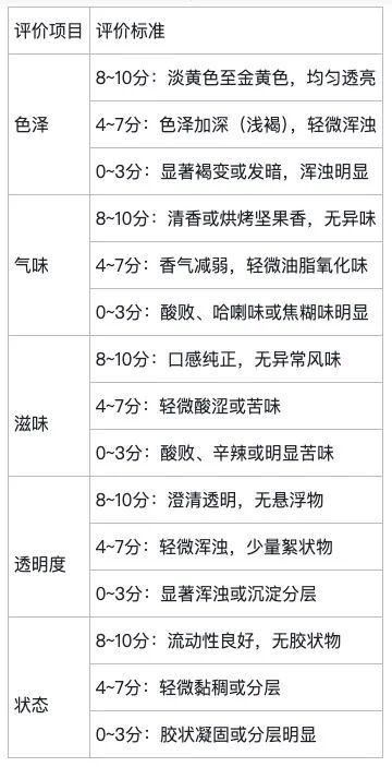 感官評(píng)價(jià)標(biāo)準(zhǔn)依據(jù)GB 2716-2018《食品安全國(guó)家標(biāo)準(zhǔn) 植物油》制定(表1)。實(shí)驗(yàn)前對(duì)評(píng)價(jià)小組成員進(jìn)行系統(tǒng)培訓(xùn),通過理論講解與樣品比對(duì),確保其精準(zhǔn)掌握核桃油在不同氧化階段的色澤、氣味及滋味特征。樣品評(píng)價(jià)流程:取20 mL油樣于透明玻璃燒杯中,在自然光線下記錄其色澤與透明度;隨后將樣品置于50 ℃恒溫水浴中加熱10 min,玻璃棒勻速攪拌后,立即嗅聞?chuàng)]發(fā)性氣味特征。滋味評(píng)價(jià)前,評(píng)價(jià)員需以溫開水漱口,取5 mL油樣于口腔內(nèi)緩慢含漱,重點(diǎn)感知酸敗、哈喇味等異常風(fēng)味。每份樣品由 12 名小組成員獨(dú)立評(píng)價(jià),結(jié)果(十分制)以去掉最高分和最低分后取平均值為準(zhǔn),結(jié)果保留兩位小數(shù)。