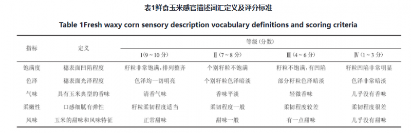 剝去鮮食玉米樣品的包裝,清洗干凈,放入沸水中煮20 min,取出放于案板上,瀝干水分,切成3~4 cm小段。由30人組成的感官評定小組對玉米樣品進行評分,每次品嘗前用清水漱口。評價標準見表1。