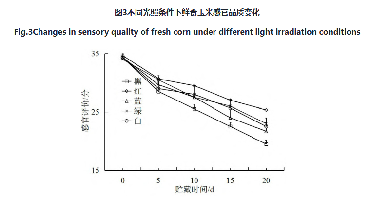 由圖 3 可知,飽滿度、色澤、氣味、柔嫩性和風味 5 個指標的總分在供試照射條件下均呈現(xiàn)下降趨勢。貯藏20 d 時,在不同光貯藏條件下隨著貯藏時間的變化,鮮食玉米籽粒的飽滿度變化不大,在白光、黑暗、藍光、綠光和紅光照射條件下均呈現(xiàn)個別籽粒不飽滿的現(xiàn)象。紅光處理下,鮮食玉米的色澤、氣味、柔嫩性和風味的評分均較高,呈現(xiàn)有個別籽粒色澤暗淡,香味較為平淡,柔韌程度和甜度一般,而這些指標在白光和黑暗評分較低,且個別籽粒暗淡,只有輕微的香味及甜味,柔韌程度較差。因此認為紅光貯藏效果最佳,能保持鮮食玉米的品質。